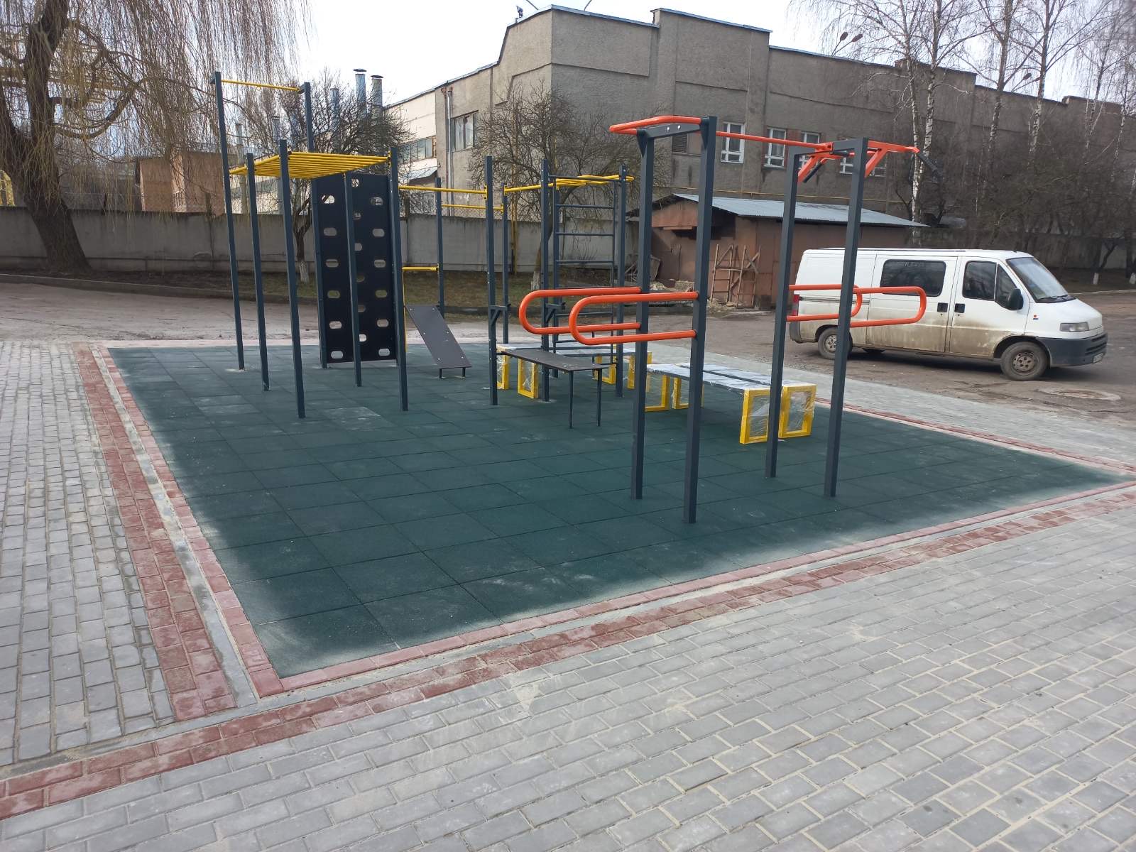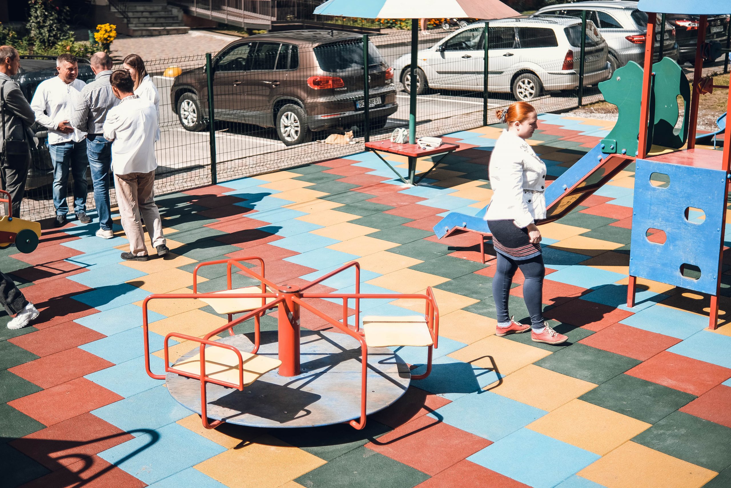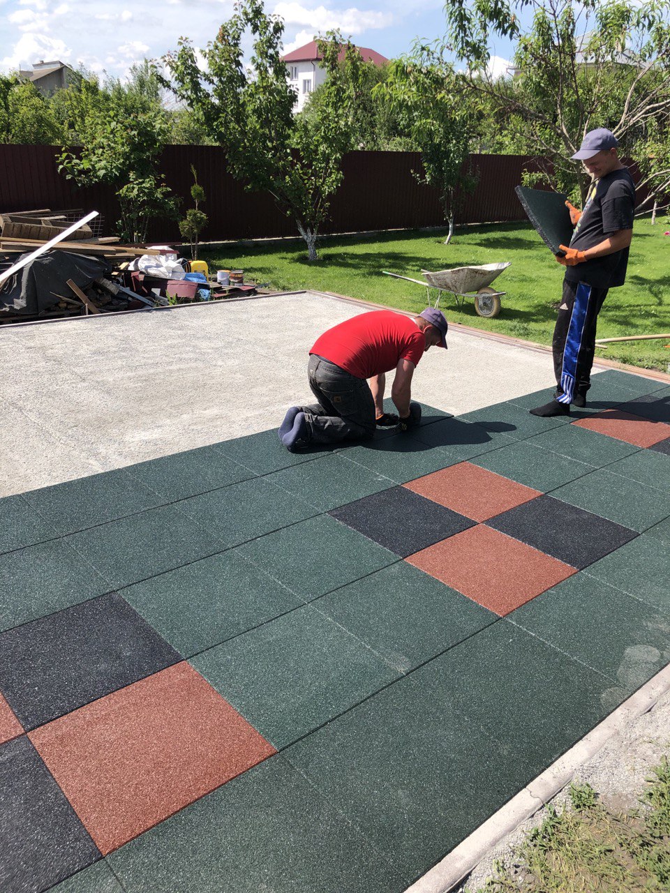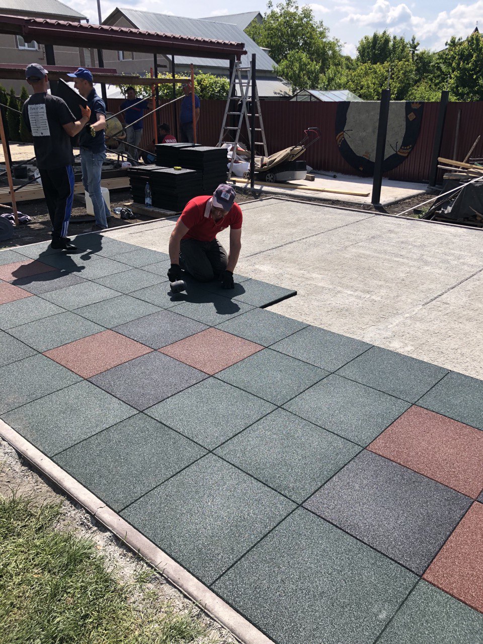 Облаштування дитячого майданчика травмобезпеним покриттям "GumOK". Розмір плитки 500х500х20. Монтаж здійснювався за допомогою поліуретанового клею.