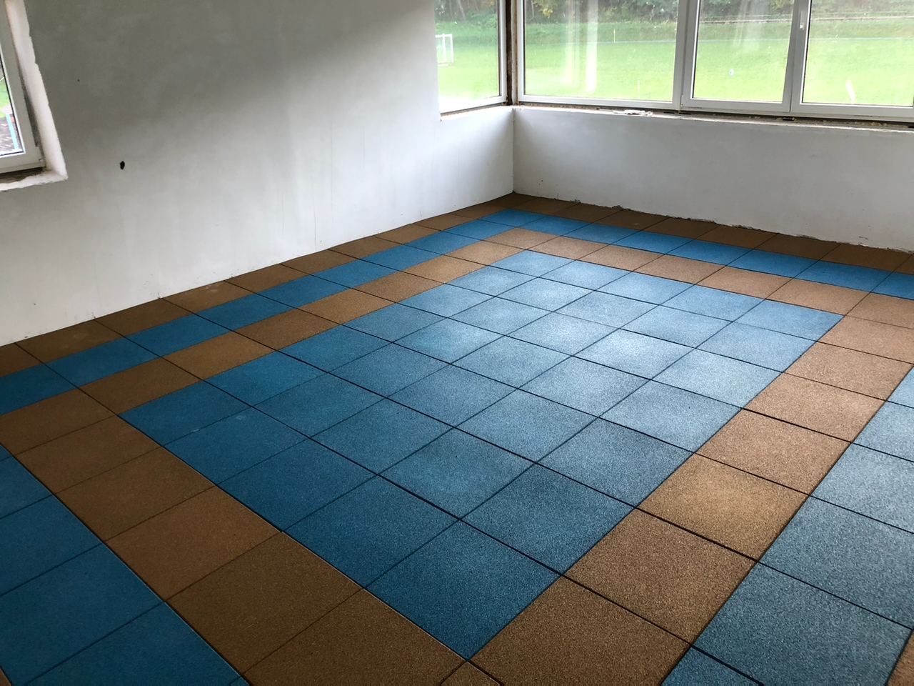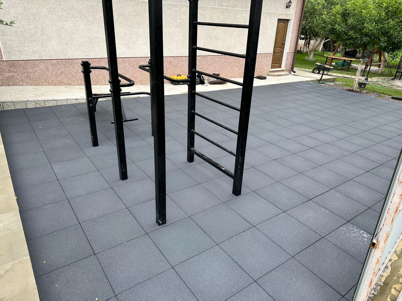 Облаштування спортивного залу гумовою плиткою. Розмір плитки 500х500х30мм. Площа - 36 м2. Монтаж здійснювався на бетонну стяжку із застосуванням поліуретанового клею.