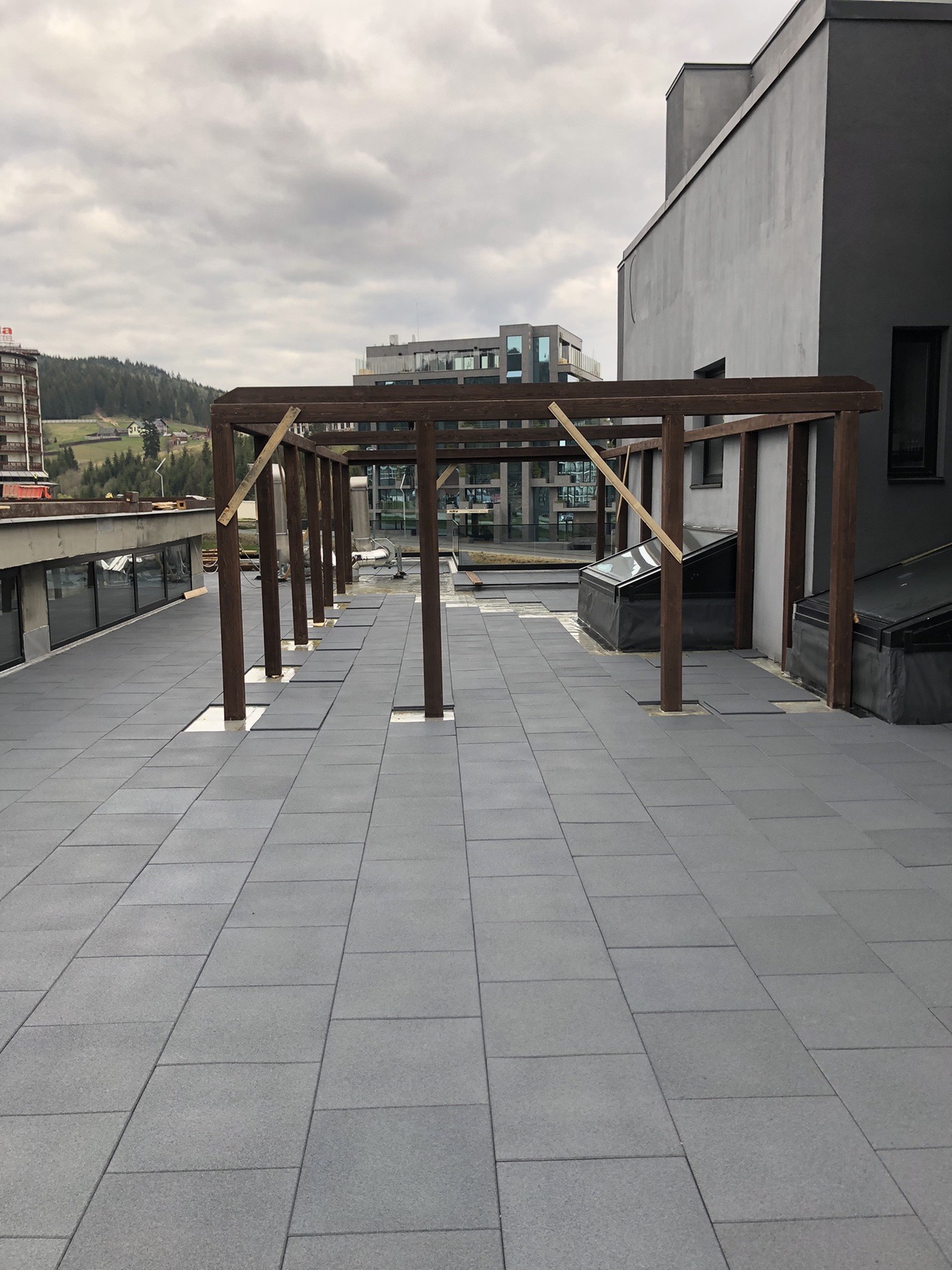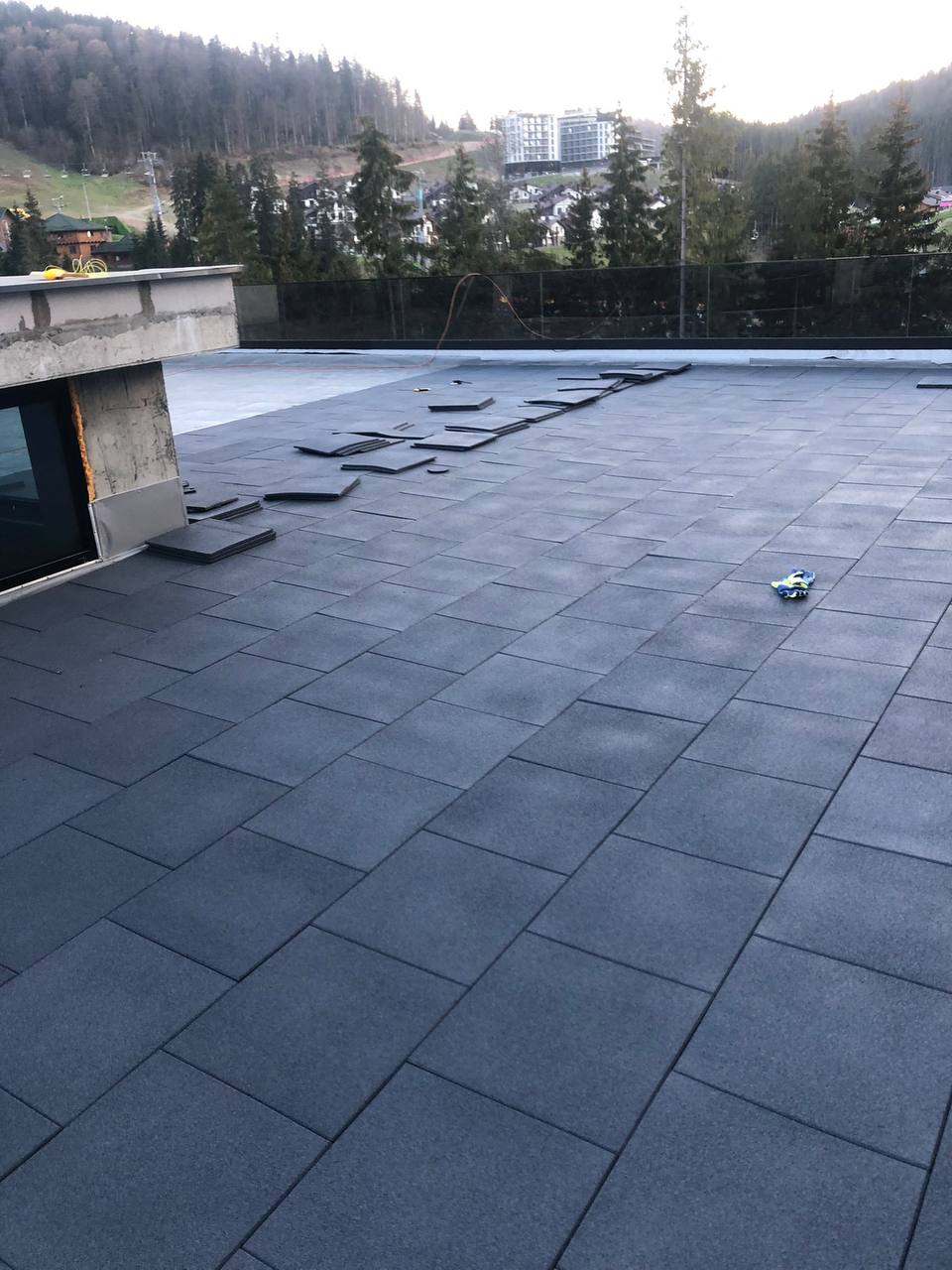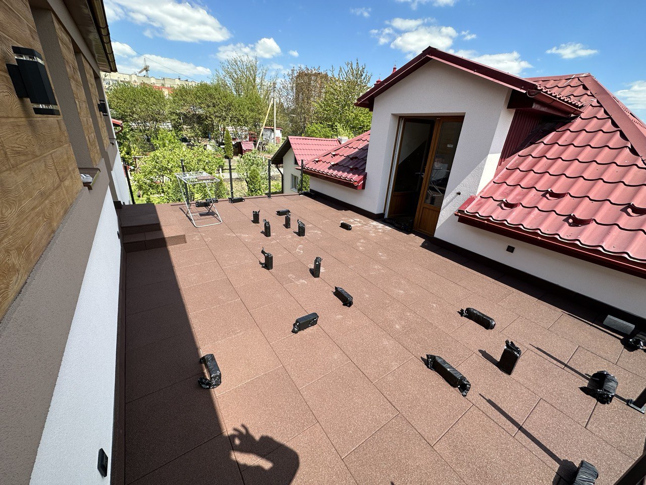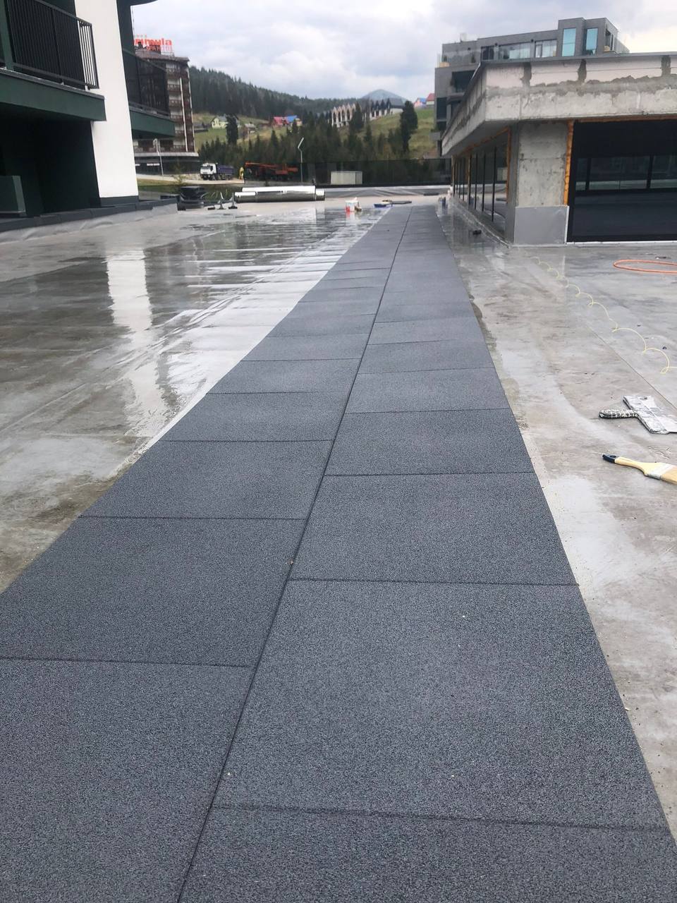Встановлення гумової плитки на терасу. Розмір - 500х500х15 мм. Площа - 600 м2. Монтаж здійснювався на гідроізоляційну мембрану із застосуванням поліуретанового клею.